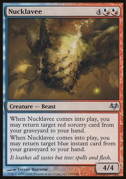 When Nucklavee enters the battlefield, you may return target red sorcery card from your graveyard to your hand. When Nucklavee enters the battlefield, you may return target blue instant card from your graveyard to your hand.