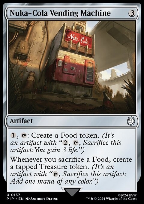 {1}, {T}: Create a Food token. (It's an artifact with "{2}, {T}, Sacrifice this token: You gain 3 life.") Whenever you sacrifice a Food, create a tapped Treasure token. (It's an artifact with "{T}, Sacrifice this token: Add one mana of any color.")