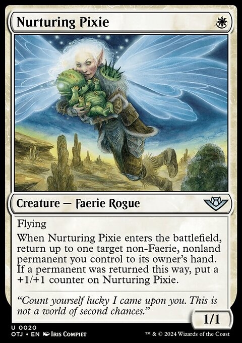 Flying When Nurturing Pixie enters the battlefield, return up to one target non-Faerie, nonland permanent you control to its owner's hand. If a permanent was returned this way, put a +1/+1 counter on Nurturing Pixie.