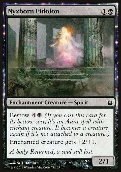 Bestow {4}{B} (If you cast this card for its bestow cost, it's an Aura spell with enchant creature. It becomes a creature again if it's not attached to a creature.) Enchanted creature gets +2/+1.