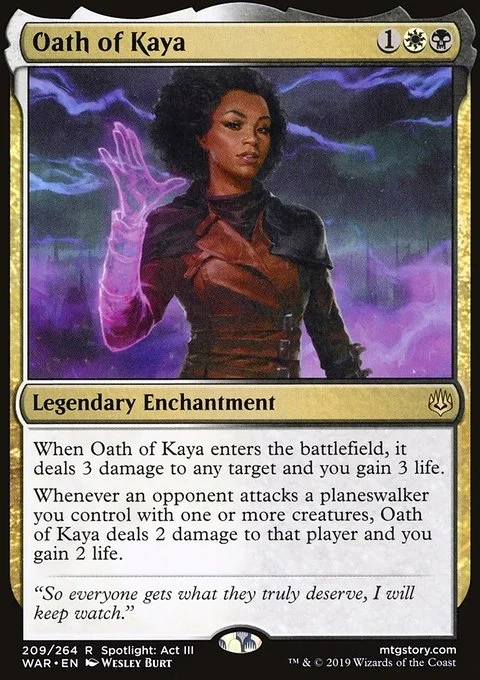 When Oath of Kaya enters the battlefield, it deals 3 damage to any target and you gain 3 life. Whenever an opponent attacks a planeswalker you control with one or more creatures, Oath of Kaya deals 2 damage to that player and you gain 2 life.