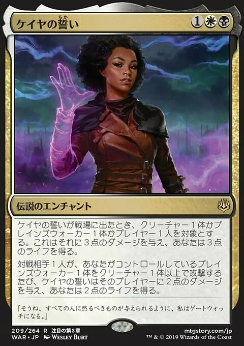 When Oath of Kaya enters the battlefield, it deals 3 damage to any target and you gain 3 life. Whenever an opponent attacks a planeswalker you control with one or more creatures, Oath of Kaya deals 2 damage to that player and you gain 2 life.