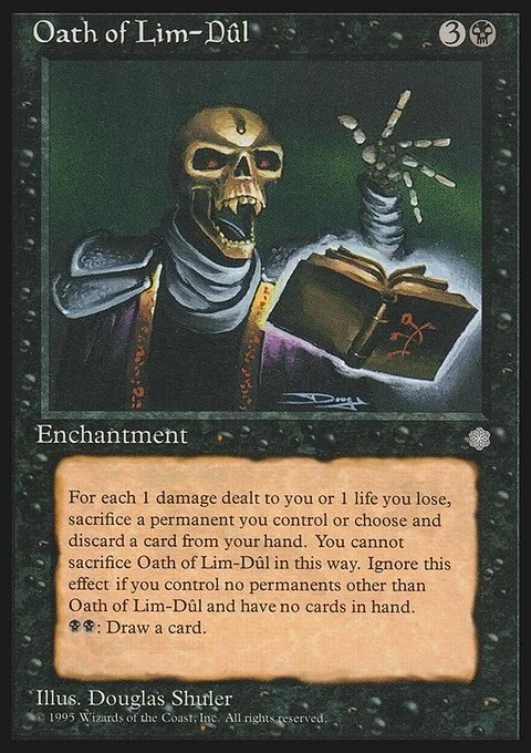 For each 1 damage dealt to you or 1 life you lose, sacrifice a permanent you control or choose and discard a card from your hand. You cannot sacrifice Oath of Lim-Dûl in this way. Ignore this effect if you control no permanents other than Oath of Lim-Dûl and have no cards in hand.BB: Draw a card.