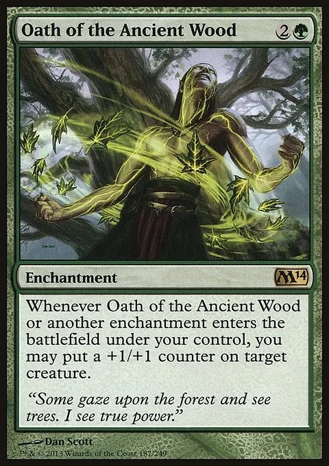 Whenever Oath of the Ancient Wood or another enchantment enters the battlefield under your control, you may put a +1/+1 counter on target creature.