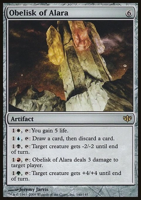{1}{R}, {T}: Obelisk of Alara deals 3 damage to target player or planeswalker.