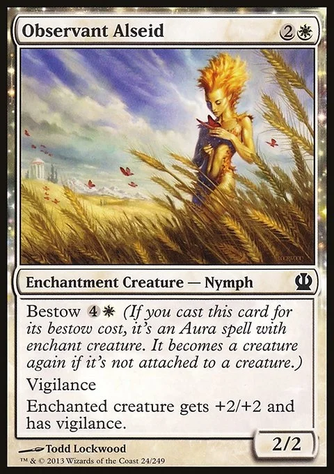 Bestow {4}{W} (If you cast this card for its bestow cost, it's an Aura spell with enchant creature. It becomes a creature again if it's not attached to a creature.) Vigilance Enchanted creature gets +2/+2 and has vigilance.