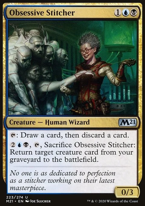 {T}: Draw a card, then discard a card. {2}{U}{B}, {T}, Sacrifice Obsessive Stitcher: Return target creature card from your graveyard to the battlefield.
