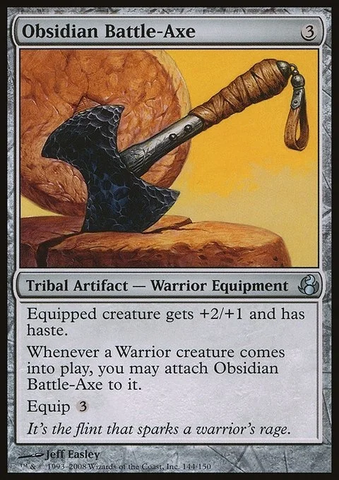 Whenever a Warrior creature comes into play, you may attach Obsidian Battle-Axe to it. Equip 3