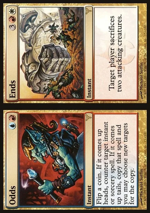 Odds Flip a coin. If it comes up heads, counter target instant or sorcery spell. If it comes up tails, copy that spell and you may choose new targets for the copy. Ends Target player sacrifices two attacking creatures.