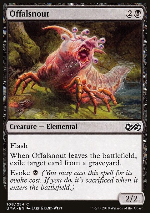 Flash When Offalsnout leaves the battlefield, exile target card from a graveyard. Evoke {B} (You may cast this spell for its evoke cost. If you do, it's sacrificed when it enters the battlefield.)