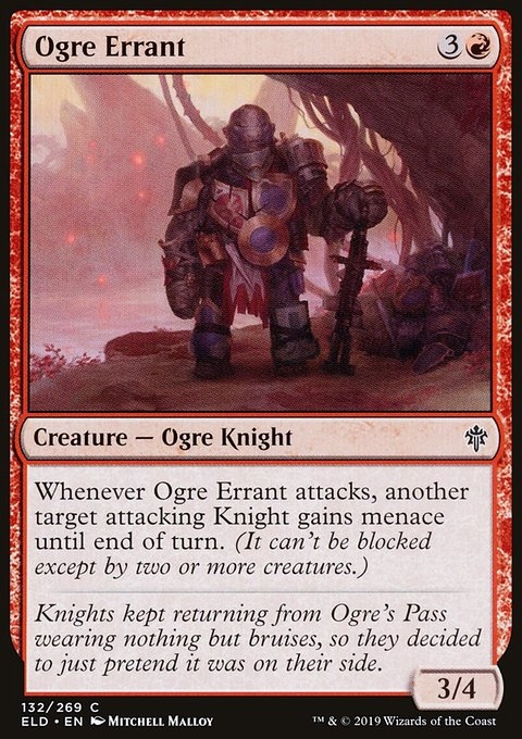 Whenever Ogre Errant attacks, another target attacking Knight gains menace until end of turn. (It can't be blocked except by two or more creatures.)