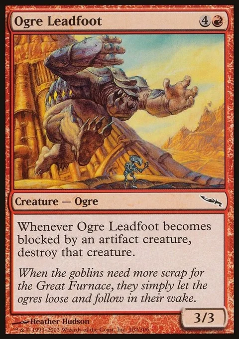 Whenever Ogre Leadfoot becomes blocked by an artifact creature, destroy that creature.