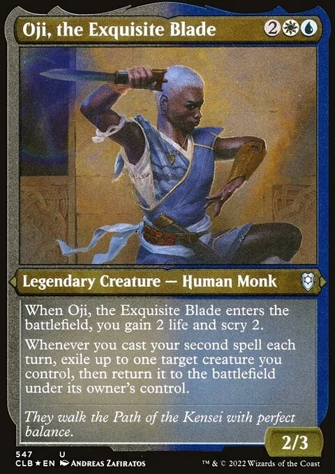 When Oji enters, you gain 2 life and scry 2. Whenever you cast your second spell each turn, exile up to one target creature you control, then return it to the battlefield under its owner's control.