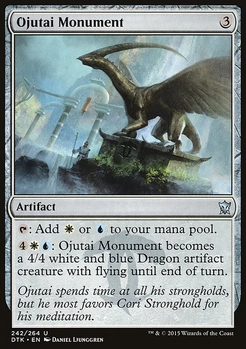 {T}: Add {W} or {U}. {4}{W}{U}: Ojutai Monument becomes a 4/4 white and blue Dragon artifact creature with flying until end of turn.