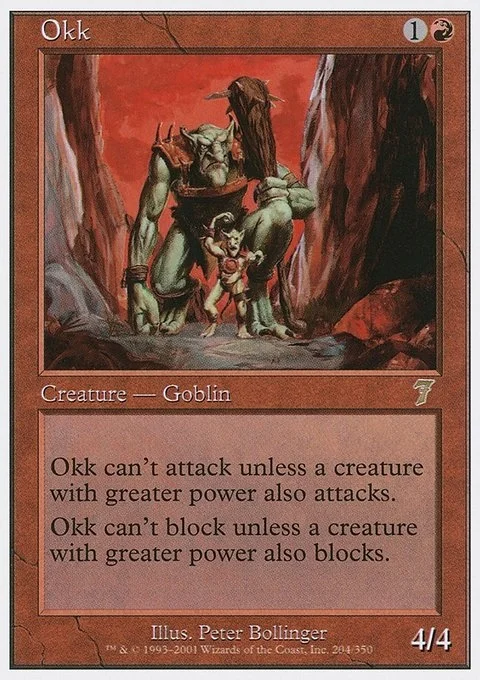 Okk can't attack unless a creature with greater power also attacks. Okk can't block unless a creature with greater power also blocks.