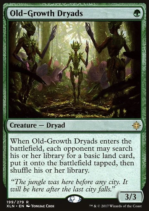 When Old-Growth Dryads enters the battlefield, each opponent may search their library for a basic land card, put it onto the battlefield tapped, then shuffle.