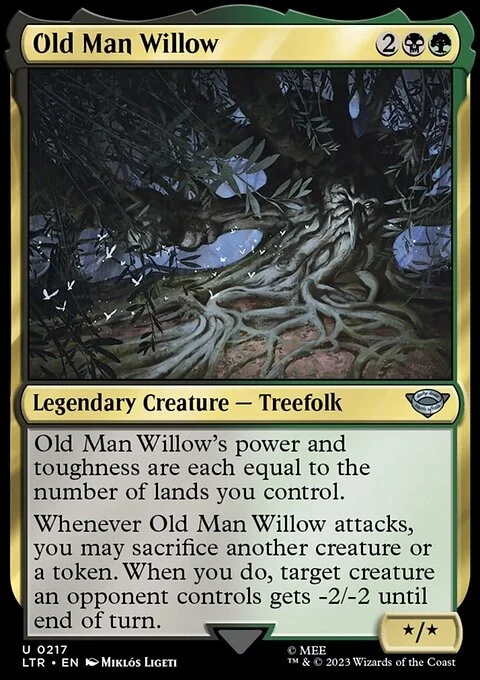 Old Man Willow's power and toughness are each equal to the number of lands you control. Whenever Old Man Willow attacks, you may sacrifice another creature or a token. When you do, target creature an opponent controls gets -2/-2 until end of turn.