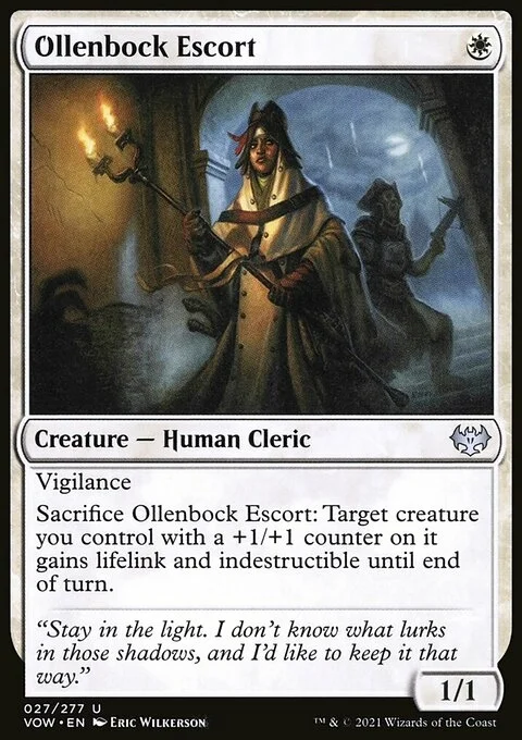 Vigilance Sacrifice Ollenbock Escort: Target creature you control with a +1/+1 counter on it gains lifelink and indestructible until end of turn.