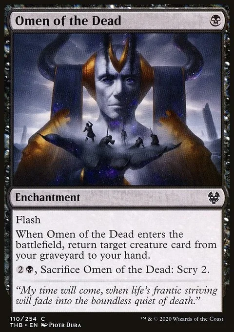 Flash When Omen of the Dead enters the battlefield, return target creature card from your graveyard to your hand. {2}{B}, Sacrifice Omen of the Dead: Scry 2.