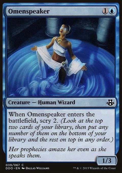When Omenspeaker enters the battlefield, scry 2. (Look at the top two cards of your library, then put any number of them on the bottom of your library and the rest on top in any order.)
