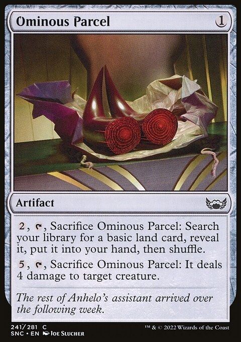 {2}, {T}, Sacrifice this artifact: Search your library for a basic land card, reveal it, put it into your hand, then shuffle. {5}, {T}, Sacrifice this artifact: It deals 4 damage to target creature.