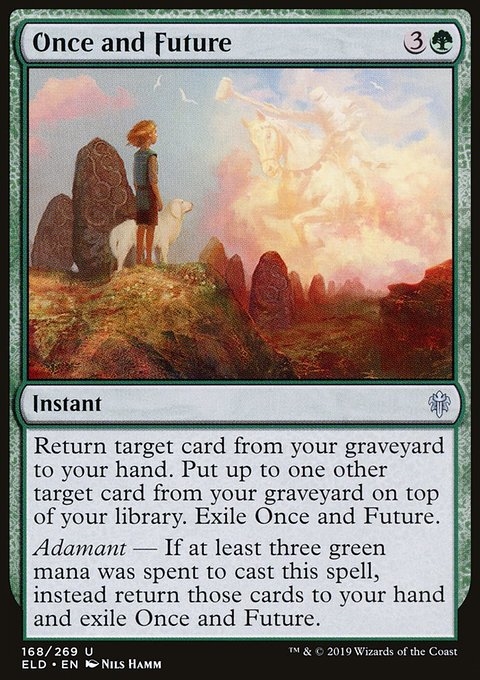 Return target card from your graveyard to your hand. Put up to one other target card from your graveyard on top of your library. Exile Once and Future. Adamant — If at least three green mana was spent to cast this spell, instead return those cards to your hand and exile Once and Future.