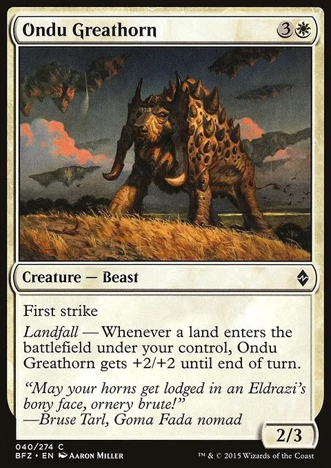 First strike Landfall — Whenever a land enters the battlefield under your control, Ondu Greathorn gets +2/+2 until end of turn.