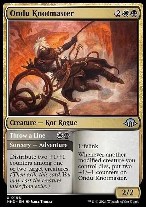 Ondu Knotmaster Lifelink Whenever another modified creature you control dies, put two +1/+1 counters on Ondu Knotmaster. Throw a Line Distribute two +1/+1 counters among one or two target creatures. (Then exile this card. You may cast the creature later from exile.)