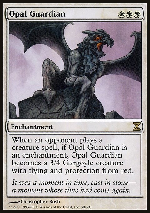 When an opponent casts a creature spell, if Opal Guardian is an enchantment, Opal Guardian becomes a 3/4 Gargoyle creature with flying and protection from red.