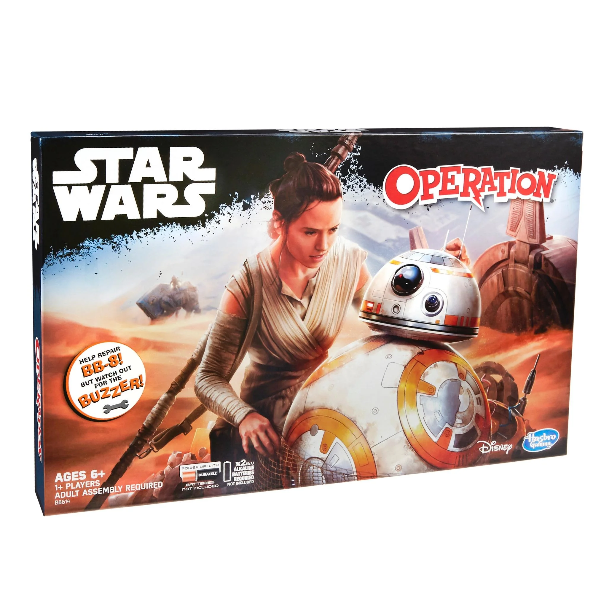 This fun version of the Operation game combines classic Operation gameplay with the excitement of the Star Wars Universe. Who can get BB-8 rolling again? After being rescued on Jakku, BB-8 is on the blink and looking for a steady hand to repair him. Remove his defective droid parts and get him rolling again, but watch out for the buzzer! The game ends when all 12 defective droid parts have been removed. Collect the most droid parts without getting buzzed, to win.