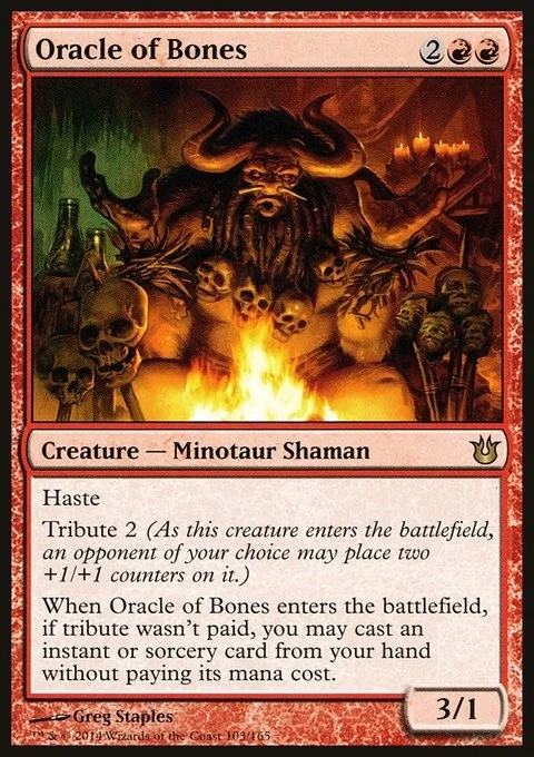 When Oracle of Bones enters the battlefield, if tribute wasn't paid, you may cast an instant or sorcery card from your hand without paying its mana cost.