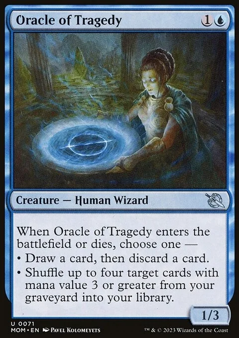 When Oracle of Tragedy enters the battlefield or dies, choose one — • Draw a card, then discard a card. • Shuffle up to four target cards with mana value 3 or greater from your graveyard into your library.