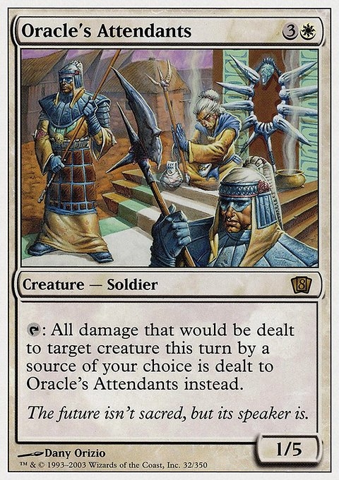 T: All damage that would be dealt to target creature this turn by a source of your choice is dealt to Oracle’s Attendants instead.
