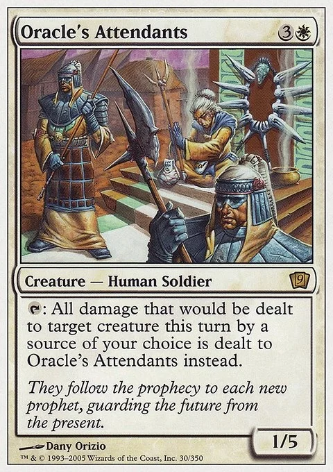 T: All damage that would be dealt to target creature this turn by a source of your choice is dealt to Oracle’s Attendants instead.