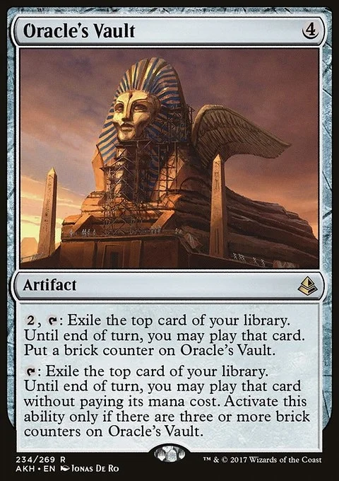 {2}, {T}: Exile the top card of your library. Until end of turn, you may play that card. Put a brick counter on Oracle's Vault.