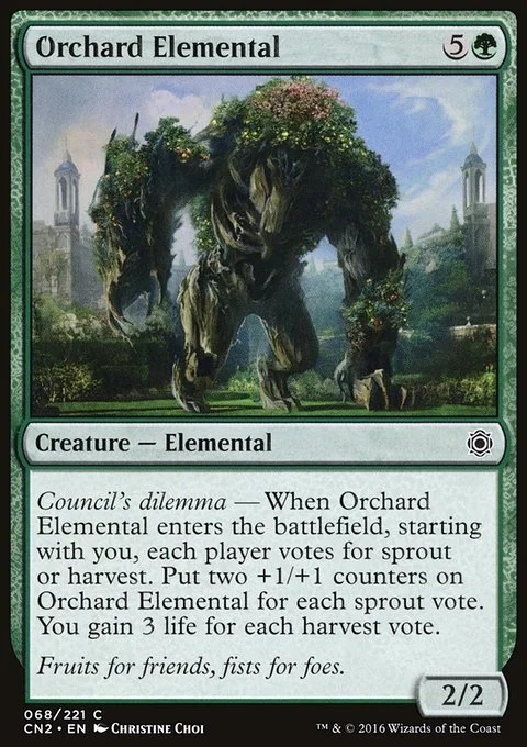 Council's dilemma — When this creature enters, starting with you, each player votes for sprout or harvest. Put two +1/+1 counters on this creature for each sprout vote. You gain 3 life for each harvest vote.