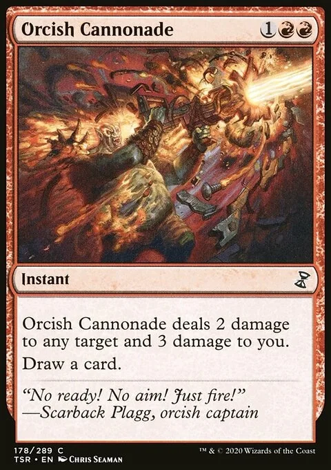 Orcish Cannonade deals 2 damage to any target and 3 damage to you. Draw a card.
