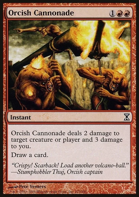 Orcish Cannonade deals 2 damage to any target and 3 damage to you. Draw a card.