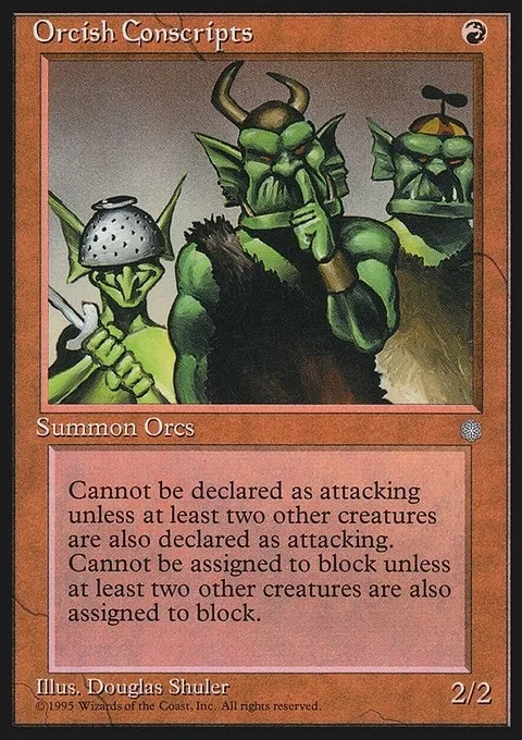 Orcish Conscripts can't attack unless at least two other creatures attack. Orcish Conscripts can't block unless at least two other creatures block.