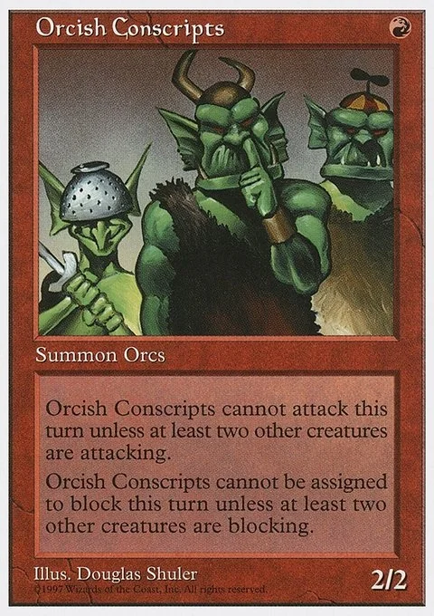 Orcish Conscripts can't attack unless at least two other creatures attack. Orcish Conscripts can't block unless at least two other creatures block.