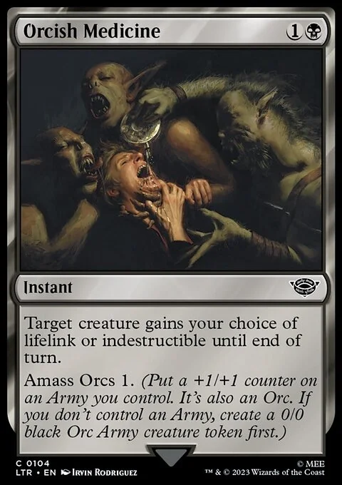 Target creature gains your choice of lifelink or indestructible until end of turn. Amass Orcs 1. (Put a +1/+1 counter on an Army you control. It's also an Orc. If you don't control an Army, create a 0/0 black Orc Army creature token first.)