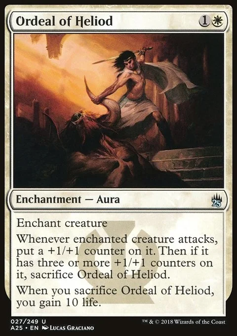 Enchant creature Whenever enchanted creature attacks, put a +1/+1 counter on it. Then if it has three or more +1/+1 counters on it, sacrifice Ordeal of Heliod. When you sacrifice Ordeal of Heliod, you gain 10 life.