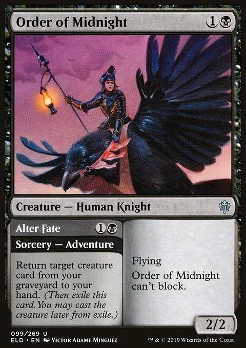 Order of Midnight Flying Order of Midnight can't block. Alter Fate Return target creature card from your graveyard to your hand. (Then exile this card. You may cast the creature later from exile.)