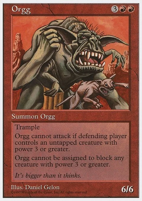 TrampleOrgg cannot attack if defending player controls an untapped creature with power 3 or greater.Orgg cannot be assigned to block any creature with power 3 or greater.