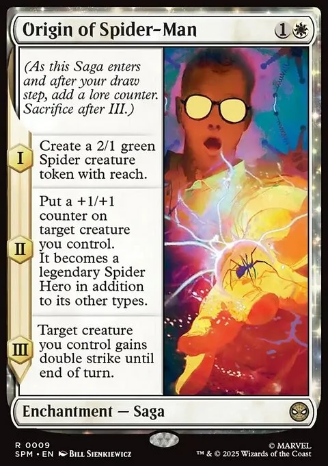 (As this Saga enters and after your draw step, add a lore counter. Sacrifice after III.) I — Create a 2/1 green Spider creature token with reach. II — Put a +1/+1 counter on target creature you control. It becomes a legendary Spider Hero in addition to its other types. III — Target creature you control gains double strike until end of turn.