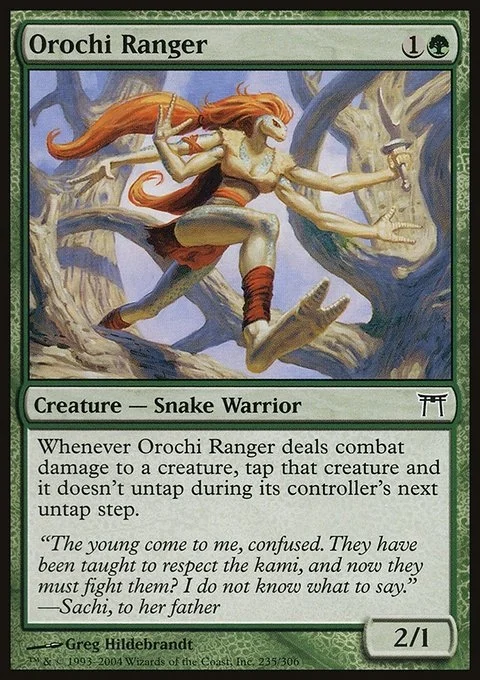 Whenever Orochi Ranger deals combat damage to a creature, tap that creature and it doesn't untap during its controller's next untap step.