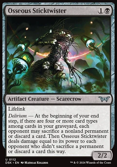 Delirium — At the beginning of your end step, if there are four or more card types among cards in your graveyard, each opponent may sacrifice a nonland permanent or discard a card. Then Osseous Sticktwister deals damage equal to its power to each opponent who didn't sacrifice a permanent or discard a card this way.