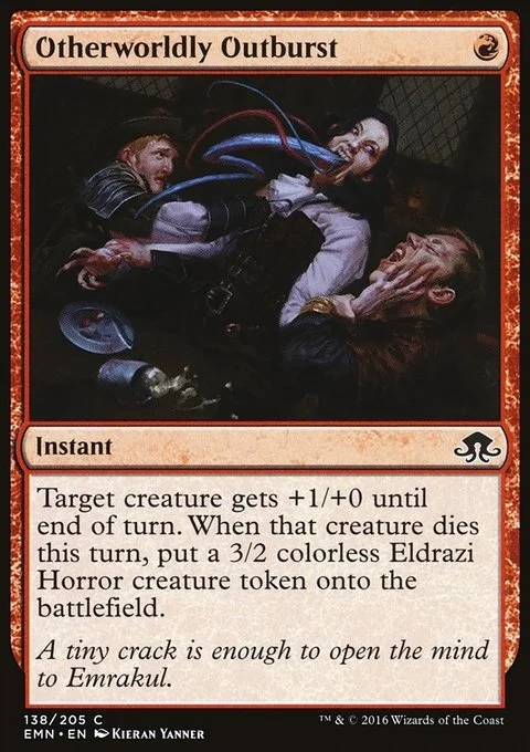 Target creature gets +1/+0 until end of turn. When that creature dies this turn, create a 3/2 colorless Eldrazi Horror creature token.