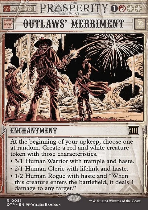 At the beginning of your upkeep, choose one at random. Create a red and white creature token with those characteristics.