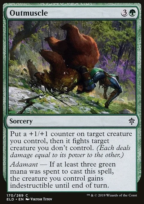Put a +1/+1 counter on target creature you control, then it fights target creature you don't control. (Each deals damage equal to its power to the other.)